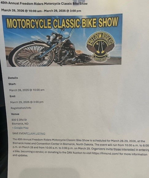 BISMARCK HOTEL AND CONVENTION CENTER 800 3RD ST, BISMARCK, ND, United StatesMOTORCYCLE SHOW NO CARS!