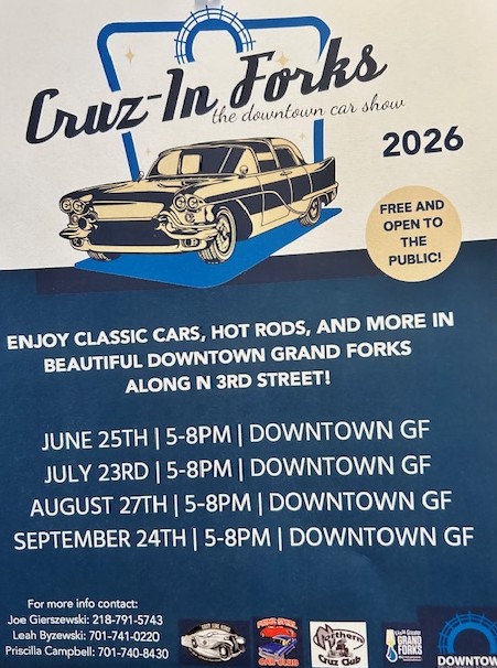 Jun 25 CRUZ-IN FORKS THE DOWNTOWN CAR SHOW, LOOKING FOR PEOPLE THROUGHOUT THE REGION TO ATTEND 5:00 pm - 8:00 pm GRAND FORKS, ND Event Details Get Directions