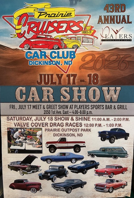 Jul 18 PRAIRIE CRUISERS 43RD ANNUAL CAR SHOW, 11:00 am - 2:00 pm DICKINSON, ND Event Details Get Directions