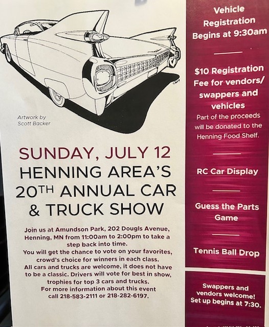 Jul 12 HENNING AREA’S 20TH ANNUAL CAR AND TRUCK SHOW 11:00 am - 2:00 pm Henning, MN Event Details Get Directions